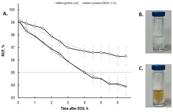 (A) Change in the radiochemical purity of [177Lu]Lu-PSMA-617 preparations with 7.4 GBq of 177Lu (samples volume—2 mL, pH 4.5, synthesis at 95 °C for 30 min, C(Na-acetate) = 0.15 mol/L, gentisic acid—5 mg (32 μmol), cysteine—3.9 mg (32 μmol); RCP value is presented as mean ± SD, n = 3); (B) Photograph of the 7.4 GBq [177Lu]Lu-PSMA-617 sample prepared with cysteine 3.9 mg (32 μmol) + DMSA 2.9 mg (16 μmol) after 24 h of storage at RT; (C) Photograph of the 7.4 GBq [177Lu]Lu-PSMA-617 sample prepared with 5 mg gentisic acid (32 μmol) after 24 h of storage at RT.