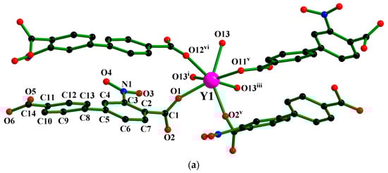X-ray single-crystal diffraction analysis revealed that the crystal structure of 1 is composed of a 3D neutral metal–organic framework based on two asymmetrical, irregular tetranuclear yttrium cubes {Y4O4} connected to twelve individual nba2− ligands, in a tetragonal system with a P21m space group (Table S1 from Supplementary Materials). The asymmetric unit of 1 contains a quarter of the formula as {[Y(μ3-OH)][Y(μ3-OH)(μ2-H2O)0.25(H2O)0.5][L]2}4, i.e., one full and two halves-occupied Y3+ cations, two nba2− anions, one full and two halves-occupied OH− anions, as well as a half and a quarter-occupied coordinated H2O (Figure S1 from Supplementary Materials). As shown in Figure 1, the two crystallographically independent nba2− ligands adopt the same coordination mode linking four Y3+ ions in a μ4-η1:η1:η1:η1 monodentate fashion, according to the bond characteristics of carboxyl units. Three crystallographic independent Y3+ ions can be classified into two groups based on their coordination numbers. For Y1 ion fully occupied at 8f site, it is coordinated by seven O atoms from four μ4-η1:η1:η1:η1 monodentate bridging crystallographically nonequivalent carboxyl radicals (O1, O2v, O11v, O12vi) and three hydroxyl groups from three symmetry-related μ3-OH− ligands (O13, O13i, O13iii) (Figure 2a). Its coordination polyhedron can be described as a seven-coordinated distorted monocapped trigonal-prism (Figure S2a from Supplementary Materials).This symmetry is in good agreement with what had been encountered in the crystal structure of the anhydrous complex [21]. While both Y2 and Y3 ions located at 4e site with a site occupancy factor of 0.50, they are coordinated by eight O atoms from two pairs imposed symmetry bridging carboxyl radicals (O5, O5x, O8iv, and O8xi for Y2; O6, O6vii, O7, and O7vii for Y3) and three hydroxyl groups from a pair of symmetry-related μ3-OH− and an isolated μ3-OH− ligands (O14, O14vi, and O15vi for Y2; O14vi, O15, and O15vi for Y3), and the last one from the coordinated water molecule (O17 for Y2; O16 for Y3) (Figure 2b,c). Their coordination geometries may be described as an approximately bicapped trigonal-prism (Figure S2b from Supplementary Materials). More detailed coordination information of Y3+ ions is summarized and provided in Table S2 (from Supplementary Materials). The eight oxygen atoms coordinated to Y3 as similar as Y2 except that O16 (O16 located at 8f site with a site occupancy factor of 0.50) monodentate bonded to Y3 instead of μ2-bridging coordination fashion O17 atom (O17 located at 2c site with a site occupancy factor of 0.25). The carbonate radical exhibits a μ4-η1:η1:η1:η1 mode to bond to four Y3+ ions (Figure 1), but the carboxylic acid on the benzene ring containing the nitro group uses an anti-coordination mode to coordinate with the Y atoms (Y1, Y1ix, Y2viii, and Y3), while the carboxylate on the benzene ring without nitro group adopt a cis-coordination fashion to coordinate with Y ions (Y2, Y3, Y1viii, and Y1ix) substituted for an anti-coordination mode. All hydroxyl groups apply the same μ3-mode to coordinate with Y3+ ions as reported in the literature [21,22,26,29,31,40,65]. The Y–O bonds have average distances of 2.262(13) Å and the O–Y–O bond angles are in the range of 63.2(8)–150.3(6)°, all in the normal parameters comparison to the related Y-MOFs or Y-CPs [64,65,66,67,68,69].