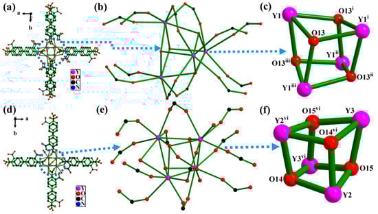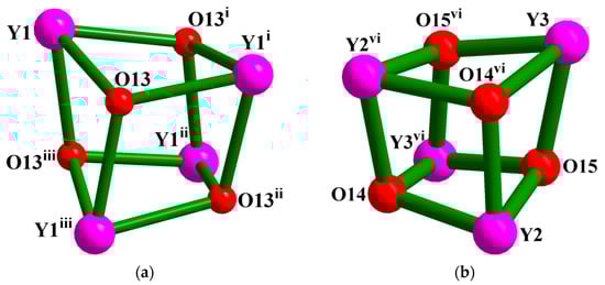 Four adjacent Y(III) ions are respectively bridged by four hydroxyl groups in a μ3-OH− bridging fashion to give two asymmetrical quadnuclear {Y4O4} cluster secondary building unit (SBU) (Figure 3a,b), namely, Y1-containg (denoted by symbol A as follows) and Y2-Y3-containing clusters (denoted by symbol B as follows). Every three adjacent YIII ions are linked by one μ3-OH group in the centre, which is slightly above the basal face and the Y–O (μ3-OH) distances range from 2.32(9) to 2.45(8) Å. Both tetranuclear {Y4O4} entities can be described as a severe distorted cube with four Y(III) ions and four hydroxyl O atoms localized on eight vertexes, while the {Y4} or {O4} constitutes a perfect tetrahedron (Figure S3a–g from Supplementary Materials). In addition, four Y3+ ions of each cube is capped by four symmetry-related μ3-hydroxyde groups for A, and with two pairs of imposed symmetry μ3-OH− involved in B. In the {Y4O4} cluster, the average Y⋯Y separation is 3.74(8) Å, which is slightly larger than the sum of metal radii (3.62 Å) of Y(III) centers, implying obvious cuprophilic interactions. While the average O⋯O distance is 2.87(7) Å, which is slightly more than the sum of van der Waals radii (2.8 Å) of O centers, implying obvious O⋯O hydrogen bonding interactions.