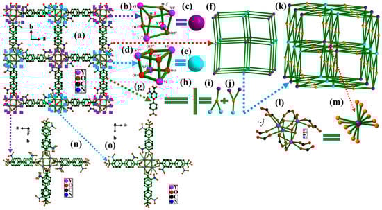 Topologically, if each {Y4O4} core serves as a 12-connected node and is linked by 12 nba2− ligands, and each nba2− chelates or bridges three {Y4O4} clusters acting as a 3-connected linker (Figure 5). The 3D structure of 1 can be simplified as a 12-connected 2-nodal Au4Ho topology (Figure 5k) with a point (Schläfli) symbol {420·628·818}{43}4 and with a stoichiometry (3-c)4(12-c) as analyzed with the TOPOS 4.0 program [86]. The distances between the centers of {Y4O4} clusters linked by nba2− are 7.94(3) and 18.07(3) Å (Figures S5 and S6 from Supplementary Materials). Interestingly, the entire structure of 1 consisted of innumerable 1D and 2D crossing frameworks in the crystal. From this point of view and as described above, the 3D MOF of 1 also can be classified as a 6-c uninodal pcu alpha-Po primitive cubic net with a Schläfli symbol {412·63} (Figure 5f).