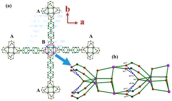 Hydrogen bonding, particularly within the coordination sphere, is another strategy which may lead to enhancement in the chemical stability at the nodes, and therefor the framework materials themselves. There are three types of hydrogen bonding interactions (O-H⋯O, O-H⋯N, and C-H⋯O) calculated by PLATON software in 1 that stabilize its structure (Table S3 from Supplementary Materials). In particular, a 4-centre trifurcated O17-H17A/17B⋯O7vi/O7xi/O7xii/O7xiii hydrogen bond (Figure 6) stabilized the crystal structure of 1; these were formed between two B clusters: the symmetry-related carboxyl group of L ligand (-O7C15O8-, O7), which is the acceptor, and the μ2-bridging oxygen of the coordinated water molecule (O7), which acts as the donor (O17⋯O7vi/O7xi/O7xii/O7xiii = 2.88(2) Å, H17A/H17B⋯O7vi/O7xi/O7xii/O7xiii = 2.17 Å, O17-H17A/17B⋯O7vi/O7xi/O7xii/O7xiii = 141.4°). The bond distances of H14⋯O9xi/O9xii, O13⋯⋯O9xi/O9xii, H16A⋯Nii, and O16⋯N2ii are 2.49 Å, 3.25(2) Å, 2.30 Å, and 3.15(3) Å, which is greater than the sum of the van der Waals radii of H and O, O and O, H and N, O and N, and the bond angles of O13-H13A⋯O2iv and C26-H26⋯O12 are 102° and 101°, which falls slightly below the preferred minimum hydrogen bond angle of 110°. Therefore, they are belonged to a very weak O-H⋯O, O-H⋯N, and C-H⋯O hydrogen bonds according to the document data [88,89,90].
