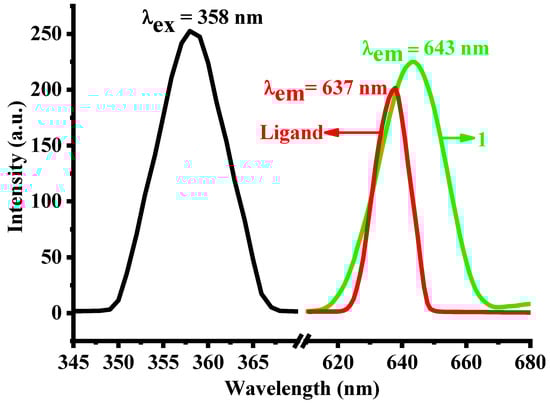 Allowing for the presence of tombarthite ion (Y3+) in 1 and the large conjugation of the ligand itself, as well as the potential strong interactions between guest molecules and the abundant coordinated polar groups of 1, we have investigated the luminescent properties of 1 and H2nba ligand in aqueous solution at room temperature (Figure 8). Interestingly, MOF 1 and H2nba have approximately the same excitation and emission peak shape, except the intensity. The maximum sharp emission peaks are centered at 643 nm (λex = 358 nm) with the intensity of 225 a.u. for 1, and 637 nm (λex = 358 nm) with the intensity of 201 a.u. for H2nba, which show characteristic red luminescence and may be attributed to π*→n or π*→π transitions. A significant red shift and the emission intensity enlargement appear compared to the emission spectrum of the ligand due to the increased degree of conjugation after the formation of MOF structure, which is often seen in transition metal based MOFs. The maximum emission wavelength showed small shifts after simply dispersing solid 1 samples in various metal salt solvents, while the fluorescence intensity differed more significant under identical concentration.