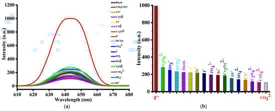 Besides metal cations, in order to improve the use efficiency of 1 as a multifunctional fluorescent probe, the fluorescence recognition anion experiments were performed to screen 16 sodium salt anions in aqueous solution (Figure 10a,b), with the concentration of the anions being 1 mM. Outstandingly, only F− afforded a quite obvious luminescent turn-on effect, with a turn-on percentage of 344.4%, but the enhancement or quenching percentage of other anions was much lower (less than 25% for S2O82−, 53% for CO32−) under the same conditions. It was also found that only slight enlargement or reduction changes occurred when detecting IO3, or PO43−, Ac−, Cr2O72−, BF4−, SO42−, CN−, C2O42−, CrO42−, while HCO3−, Cl−, Br− and I− had almost no fluorescence intensity changes.