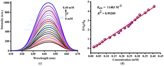 Quantitative experiments were then carried out with 1 suspension selected as reference and NaF solution was increasingly added to monitor the emissive response. On account of the distinct response of 1 toward F−, the turn on effect of F− was subsequently explored with a function of NaF in the concentration range of 0~0.40 mM. As shown in Figure 10c, when the F− concentration was gradually raised from 0 to 0.40 mM, the fluorescence intensity from 225 a.u. promoted little by little to about 1000 a.u., and the fluorescence intensity significantly increased by nearly 4.5 times when the concentration of the F− ions reached 0.40 mM, exhibiting very strong fluorescence response.