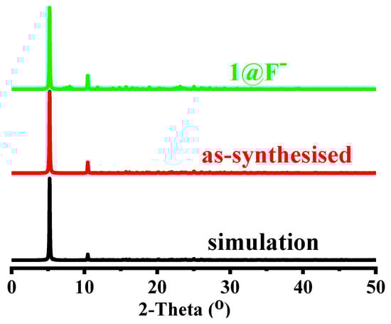 The powder X-ray diffraction (PXRD) pattern of 1 is shown in Figure 11. The experimental peaks are consistent with the theoretical one obtained by single-crystal X-ray data. To confirm the phase purity and stability, 1 was treated with NaF aqueous solution at room temperature. Then, the MOF powders were collected and dried in air after 1 was soaked in these solutions for 12 h. The powder X-ray diffraction (PXRD) measurements were carried out to study the structures of the original and anion incorporated MOF samples of 1@F−. The PXRD pattern of the 1@F− is similar to that of 1, respectively, ruling out the collapse of the MOF frameworks. The slight variation of diffraction intensity may be related to the different crystal orientation or solvent effects. Although the experimental patterns have a few unindexed diffraction lines and some are slightly broadened in comparison to those simulated from single-crystal model, it can still to be considered that the bulk synthesized materials and as-grown crystal are homogeneous, implying its excellent stability.