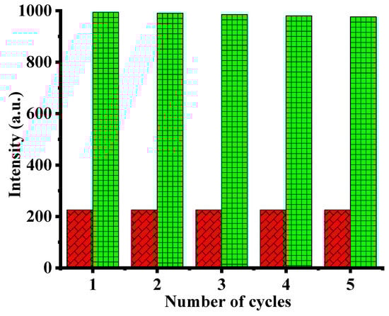 Photoluminescence intensity of 1 in five recyclable experiments for the F− in aqueous solution (The red bar shown the initial fluorescence intensity, the green bar shown the intensity upon addition a distilled water of 1mM F− anion).