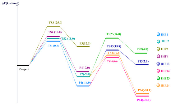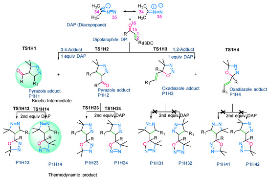 The computed energy values of the different TSs and products with respect to the reagent were summarized in the energy diagram (Figure 6). We have found that 1HP1 (pyrazole) was the most stable product. The latter was obtained by the attack on the C=C bond. However, 1HP3 and 1HP4 (oxadiazoles), which are obtained after the reaction on the C=O bond were kinetically and thermodynamically unfavoured since they exhibited the highest activation energy (= E(TS) − E(Reagent)) and free energy of reaction (= E(Product) − E(Reagent)), respectively. Kinetically, the pyrazoles 1HP1 and 1HP2 possess the lowest activation energy values and are also, thermodynamically, the most stable ones. Consequently, we have investigated the reaction of the obtained pyrazoles 1HP1 and 1HP2 with a second equivalent of 2-diazopropane. The component 1HP14 was the thermodynamic product since it exhibits the lowest free energy value.