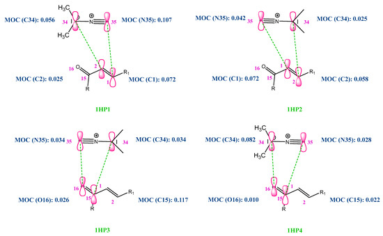 In this approach, we applied the rule of Houk [44,45], for the heterocycloaddition reaction. The rule of Houk, “small-small” and “large-large” type interactions are more favored in comparison with those of ‘large-small’ and ‘small-large’ types as explained in Figure 4. Following the results in Figure 5, the reaction occurs for the first time between N35 and C1 in the case of P1 (DAP and (C=C) alkene as DP). Then, we can conclude that the first formed bond length during the reaction is N35-C1. However, in the case of the C=O alkene as DP, we have found less favored interactions (the two opposed sites, which are concerned by the interaction, possess large/small Molecular Orbital Coefficients, MOC). These results are in good agreement with the experiment [43], and we can understand that the cycloaddition occurs between the DAP and the C=C alkene.