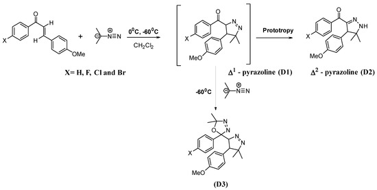 A solution of 1.5 mmol of enone (chalcone derivative) in 20 mL of anhydrous dichloromethane is cooled to −60 °C and added fractionally to 10 mL of freshly prepared 2.7 M DAP solution stored at (−60 °C). The very slow decoloration of DAP indicates a slowing down of the reaction [73,74]. After one night at 0 °C, the solvents are evaporated at low temperature, the obtained oil is chromatographied on 150 g of silica by eluting with hexane progressively enriched to 20% of ethyl acetate. The majority pyrazoline D2 is recovered, followed by the more polar adduct D3 [75].