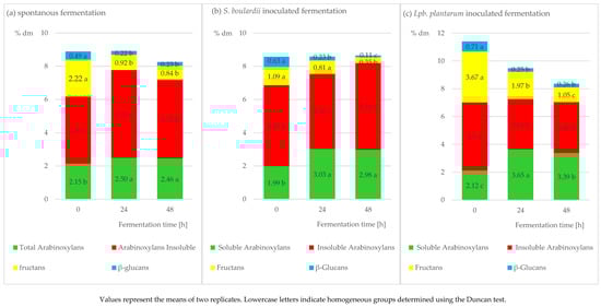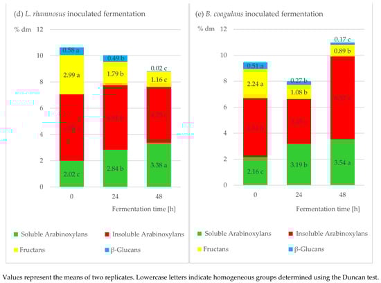 Type of Fermentation | Starch | Total Arabinoxylans | Soluble Arabinoxylans | Arabinoxylans Insoluble | Fructans | β-Glucans | Total Fiber | Soluble Fiber | Insoluble Fiber |