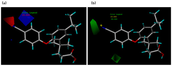 Contours of CoMFA analysis: (a) contours of electrostatic contribution were represented in red and blue; (b) contours of steric contribution were represented in yellow and green.