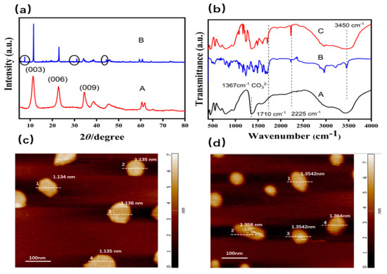 (a) XRD patterns of MgAl-LDH (A) and 7b/MgAl-LDH-2 (B); (b) FT-IR spectra of MgAl-LDH (A), 7b (B) and 7b/MgAl-LDH-2 (C); (c) AFM image of MgAl-LDH; (d) AFM image of 7b/MgAl-LDH-2.