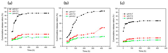 Controlled-releasing curves of complexes 7b/MgAl-LDH-1 (a), 7b/MgAl-LDH-2 (b), and 7b/MgAl-LDH-3 (c) under the conditions with different pH values.
