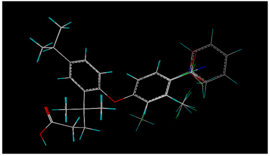 The nineteen target compounds were superimposed, and the result is shown in Figure 8. The inhibition rate against A. solani was converted to the AF using the formula: AF = log{[relative inhibitory rate/(100 − relative inhibitory rate)] × molecular weight}. The established 3D-QSAR model was inspected by the partial least-squares means. Its predictive ability was estimated by a cross-validated value squared (q2), a correlation coefficient squared (r2), a standard deviation (S), and a Fisher validation value (F).
