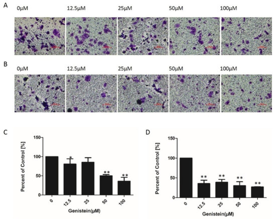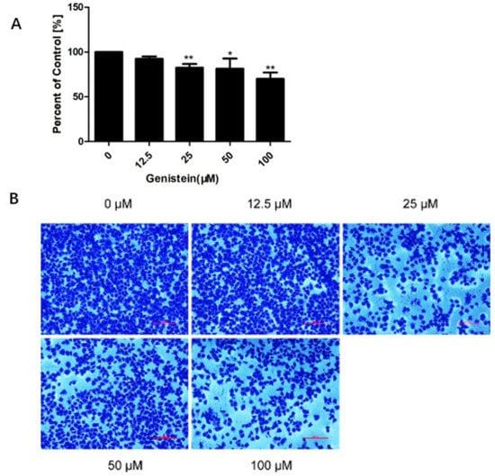 2.7. Genistein Inhibited Cell Migration and Invasion of HeLa Cells in Transwell® Assays