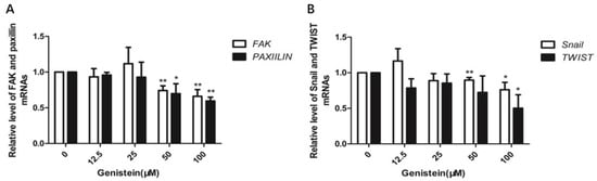 2.10. Genistein Inhibits Gene Expression of FAK, Paxillin, Snail, and Twist