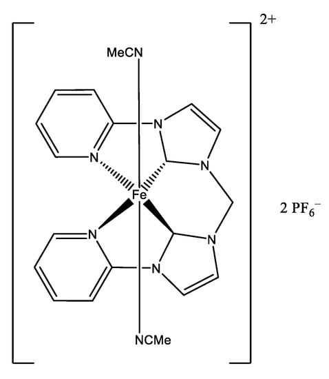 Structure of an iron(II) complex bearing a tetradentate bis(pyridyl-N-heterocyclic carbene) ligand. Adapted from [26].