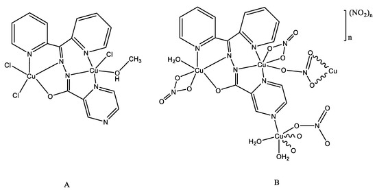 Structure of the copper(II) complexes derived from aroylhydrazone N’-(di(pyridin-2-yl)methylene)pyrazine-2-carbohydrazide; (A) Complex [Cu2(μ-1κN3,2κN2O-L)(Cl)3(MeOH)] (B) 1D polymer [Cu3(μ3-1κN3,2κN2O,3κNL)(μ-NO3)(NO3)3(H2O)3]n·nNO3. Adapted from [29].