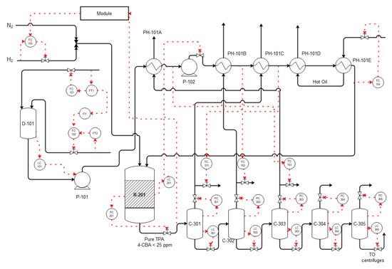Flow sheet of the industrial hydropurification plant for TPA with improved PID control. Adapted from [68].