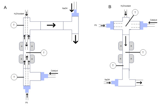 The opposed-flow reactor consists of a PX pipe that is concentric with the catalyst pipe, and both point upwards, where they meet the downward flowing stream of heated H2O + O2. All reactants should be efficiently mixed in the middle section of the reactor, after which they flow upwards to the outer section (concentric tube configuration) until the NaOH quench. In the tubular reactor, all reactants and solvents are mixed at the top of the reactor, which then lets the mixture flow downwards, where the NaOH quench solution is rapidly cooled at the bottom. The residence times for the opposed-flow reactor were not calculated accurately, but the authors considered that they should be around 2.3–3.3 s at 380 °C and 7.4–11.9 s at 330 °C, whereas in the tubular reactor, they were 5.8 s at 380 °C and 19.2 s at 330 °C.