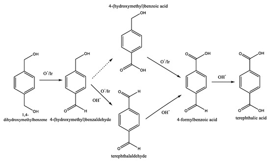 Goulas et al. [27] screened the oxidation of di-hydroxymethyl benzene (DHMB) to terephthalic acid using several metals supported on carbon, such as Au, Pt, Pd, Cu, and Ir. In the first test, performed at 90 °C and 1 bar of oxygen, Pd led to the highest conversion but low yields for the oxidation products. The same trend occurred with Pt. Both were reported to be good C-C bond scission catalysts. Metals are known for their oxidative power; for exampke, gold and copper only oxidized DHMB to HMBA, while the Ir catalyst obtained a 93% oxidation product yield, including 55% for TPA at full conversion of DHMB. When comparing all the metals at similar conversion of between 60 and 75%, Ir presented a minimal loss of carbon. Under optimized conditions, the Ir/C catalyst promoted the full conversion of DHMB, leading to a maximum yield of TPA of 76% after 20 h, at 100 °C, with 12 bar of O2. Under the same conditions, p-xylene did not react; therefore, this type of catalyst appears to be more suitable for a biomass-based processes, or later, oxidation within the full process. The authors explored the possible mechanism (Scheme 3) followed by the iridium catalyst. By subjecting the reactants and intermediate oxidation products to reaction conditions in the presence and absence of a catalyst, it was interestingly observed that DHMB was not converted in the absence of a catalyst, while HMBA and terephthalaldehyde were. The authors explained that the presence of a single aldehyde group activated the molecule for the radicalar reaction. Lastly, DHMB and 4-hydroxymethylbenzoic acid were inert in the absence of the iridium catalyst, reinforcing the radical hypothesis.