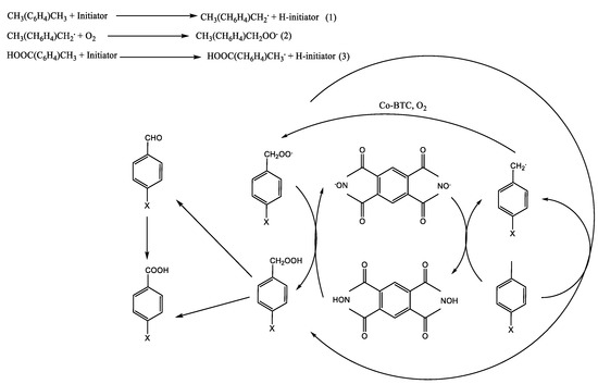 The mechanism proposed for the oxidation of p-xylene, which is catalyzed by Co-BTC/NDHPI X = CH3, COOH. Adapted from [53].