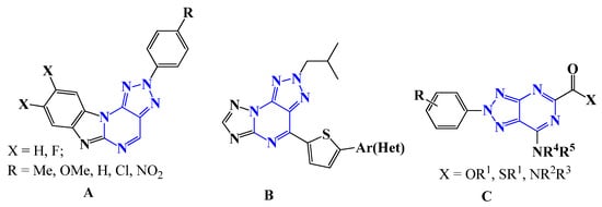 The main advantage of the azolodiazine domain of 1,2,4-triazole-containing hybrid molecules is associated with a planarized skeleton of aza-heterocyclic core, which has an important effect on structural modifications [9], biological interactions [10] and chromophore properties [11]. Benzoimidazo[1,2-a][1,2,3]triazolo[4,5-e]pyrimidines A (Figure 1) demonstrated aggregation-induced emissions (AIE) and acidochromic behaviour [12]. The emission spectra of 2H-[1,2,3]triazolo[4,5-e][1,2,4]triazolo[1,5-a]pyrimidine derivatives B in acetonitrile solutions are sensitive to the presence of nitroaromatic explosives [13]. Fluorescent 2-aryl-1,2,3-triazolopyrimidine C was demonstrated to penetrate cells and selectively accumulate in the cell membrane, Golgi complex and endoplasmic reticulum, which opens up wide opportunities in bioimaging [11].