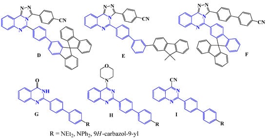 The quinazolinyl moiety possesses a stronger electron-withdrawing ability than the pyrimidinyl core due to extra electron delocalization into the fused benzene ring. Enhanced intramolecular charge transfer (ICT) in quinazoline chromophores was illustrated by red-shifted absorption and emission with regard to their pyrimidine analogs [14]. There is limited data on the optical properties of 3,5-diarylsubstituted [1,2,4]triazolo[4,3-c]quinazolines. 5-Fluorenyl-, 5-spirofluorenyl and 5-(3(4)-fluorenyl)phenyl substituted 3-(4-cyanophenyl)-[1,2,4]triazolo[4,3-c]quinazolines (compounds D–F, Figure 2) were reported as novel electron transport heterocycles for efficient OLED materials possessing proper molecular dipole moments, which are able to be in compact contact with other organic layers in the process of forming a device [15]. Analogs of compounds D–F bearing a triphenyl-1,3,5-triazine fragment instead of a cyanophenyl one were mentioned in patent [16], and some 5-phenyl-, 5-biphenyl- and 5-napthyl- derivatives of [1,2,4]triazolo[4,3-c]quinazolines containing triphenyl-1,3,5-triazine residue in position C(3) have been developed [17].