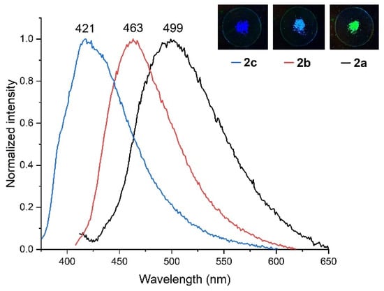 Normalized emission spectra of quinazolinones 2a–c in solid state; inset: emission of compounds 2a–c in solid state (powder). Photographs were taken in the dark upon irradiation with a hand-held UV lamp (λem = 366 nm).
