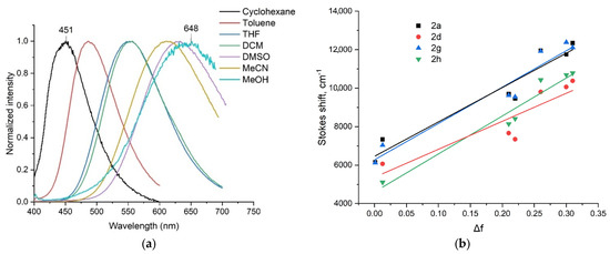A study of luminescent properties in solvents of different polarity was performed for compounds 2a, 2d, 2g and 2h possessing high emission intensity in toluene (ΦF 47−94%) and MeCN (ΦF 24−34%) (Supplementary Materials—Tables S5–S8, Figure S25). The values of the emission maxima in different solvents are presented in Table 2. It has been shown that with increasing solvent polarity, the emission maximum of these chromophores underwent a red shift; the positive emission solvatochromism was observed. The most significant changes in the emission spectrum were noticed for compound 2a (λem = 451 nm in cyclohexane and λem = 648 nm in methanol) (Figure 5a).