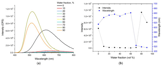 Frequently, triphenylamino (TPA)-containing compounds demonstrate enhancement of emission intensity (AIEE) or inducement of emission (AIE) upon aggregation [22,23,24,25,26]. The X-ray data (Figure 3) obtained for quinazoline derivative 2e bearing the TPA unit confirms the non-planar structure of the studied molecules. We considered the absorption and emission behavior of the compounds 2b, 2e and 2h upon the addition of water based on the above-mentioned analysis on passing from MeCN solution to solid state. For this aim, we registered absorption and emission spectra of fluorophores 2b, 2e and 2h (at c = 2 × 10−6 M) in pure MeCN and in MeCN/water mixtures with various water fractions (fw); see Figure 6 and Supplementary Materials Figures S26–S28. Figure 6 demonstrates changes in fluorescence spectra of 2e in MeCN and MeCN/water mixtures (a) and a plot of relative PL intensity (I/I0) and wavelength at emission maxima of 2e versus the composition of the water fraction (b) at room temperature. After the first portion of H2O, we observe a dramatic attenuation of emission intensity and red shift of the band. After 70vol% of water, the band shifts toward the blue region with the regeneration of intensity, and the strongest emission was measured at 80vol% of water. Other compounds (2b and 2h) demonstrate similar changes in emission spectra. These changes are typical for luminogens with a rotatable donor–acceptor (D–A) structure, which possess two excited states: a locally excited (LE) state and a twisted intramolecular charge transfer (TICT) state. When the polarity of media increases (upon the addition of water), the TICT state becomes dominant, leading to red-shifted emission and the quenching of intensity. Further addition of water most likely led to the formation of aggregates that are less polar than initial single molecules, and this phenomenon resulted in blue-shifted emission. The intensity restores due to the restriction of rotation in the TPA group and phenylene moieties and the reducing non-radiative transitions. Thus, compounds 2b, 2e and 2h exhibited aggregation-induced emission enhancement to some extent.
