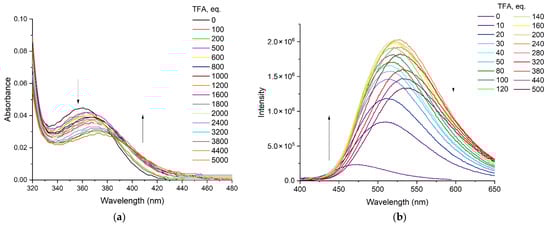 Changes in absorption (a) and emission (b) spectra of the toluene solution (c = 10−5 M) of 2e upon gradual addition of TFA.
