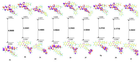 Optimized molecular structures and molecular orbitals of the HOMO and LUMO levels, energy gaps and electron cloud distribution of triazoloquinazolines 2a–i.