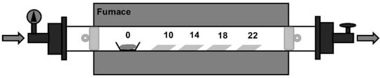 Scheme of the CVD system. Two quartz plugs were placed inside the quartz tube to establish the reaction zone. At the gas entrance (from left to right), was placed a quartz plug, at 10 cm from it was placed the boat with the precursor. The FTO substrates were located 10, 14, 18, and 22 cm from the boat. In the gas exit, a second plug was located (12 cm away from the last substrate). It is important to notice that the plugs do not seal the tube, they only obstruct the flow out from the reaction zone.