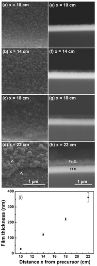 (a–d) correspond to 45-degree tilted view SEM micrographs of samples prepared at the positions 10, 14, 18, and 22 cm, respectively. In (d), Z1 and Z2 denote two different zones of the sample, the zone with hematite and the zone of bare FTO, respectively. (e–h) correspond to cross-section SEM micrographs of the same set of samples. (i) Plot of the film thickness (determined by the cross-section micrograph) as a function of their distance to the precursor.
