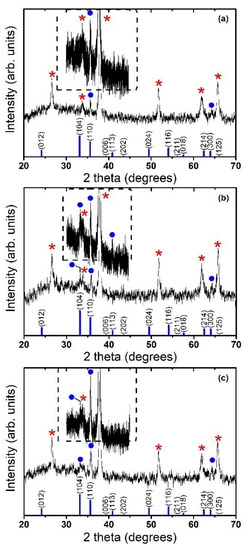 In order to study the structural properties of the hematite films, X-ray diffraction experiments have been carried out. Figure 4 shows the X-ray diffraction patterns of films prepared at positions 14, 18, and 22 cm. It can be seen that all diffraction peaks (except the peaks of the substrate), can be indexed to the rhombohedrally centered hexagonal structure of Fe2O3 (α-Fe2O3, hematite), which are in agreement with standard reported values [37], see JCPDS pattern at the bottom of each panel in Figure 4. All samples are polycrystalline, and the broadening of the diffraction peaks demonstrates the nanocrystalline character of nanostructured α-Fe2O3 layers. An average crystallite size could be obtained using the Scherrer formula for the crystallite size broadening of diffraction peaks: