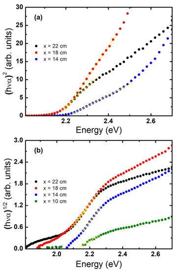 Comparing the values of both determinations, in all cases, the energy gap is lower when it is calculated as an indirect edge. The difference between a direct and indirect energy gap is between 100 and 200 meV. The linear region is clearer and more evident for the case that a direct transition is assumed. Recently, the properties of the hematite were calculated by several ab initio techniques, showing an indirect edge and a direct edge, dozens of meV above, from the calculation of its band structure [57]. Meanwhile, the absorbance obtained from the same calculations shows the behavior of a direct absorption edge like these samples [54]. If both bandgaps are present, the absorption due to direct bandgap dominates because it does not involve interaction with phonons, so it is a transition much more probable and faster. A shift of the Eg to lower energy values from the closest sample to the precursor (x = 10 cm) to the furthest (x = 22 cm) can be observed; the Eg energy decrease and the sample gets darker. It may be related to a decrease in the Eg value with the increase of the film thickness. This tendency was already reported for α-Fe2O3 [21,58] and other semiconductor oxides [59].