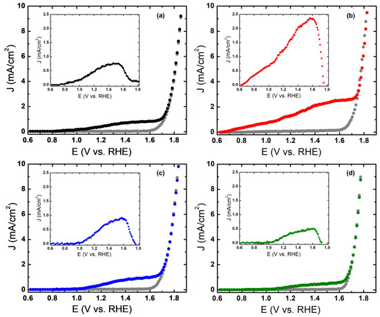 The insets of Figure 8a–d correspond to plots of the difference of the current density under illumination and darkness against the potential. It is clearly observed that sample 18 has a greater photocurrent at all potentials, particularly at 1.23 and 1.58 V, it presents 1.31 and 2.36 mA/cm2, respectively. The anodic character of the photocurrent indicates that the film exhibits photoactivity with n-type behavior [1,7,9,28]. The oxygen vacancies are the main defects in hematite films, and these are responsible for the n-type behavior, due to the electrons that are donated to the driving band [13].
