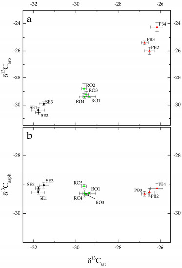 In the past and recent literature [12,28,29], δ13Csat and δ13Caro have also been used to find the provenance of archaeological bitumen samples. These measurements were performed on PB, RO and SE samples: Table 1 lists both δ13Csat and δ13Caro and Figure 1a shows the resulting graph.