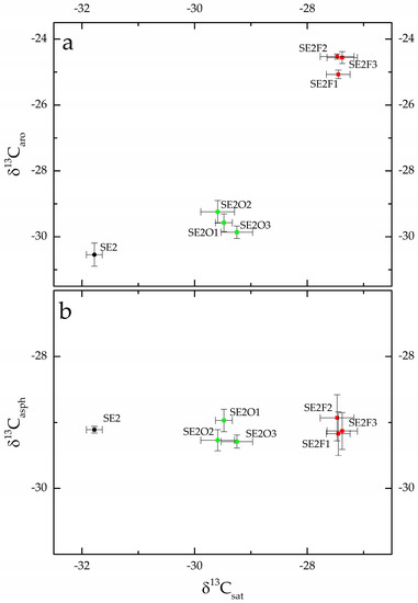 (a) δ13Caro vs. δ13Csat and (b) δ13Casph vs. δ13Csat graph of both geological SE2 bitumen and of the SE2 bitumen soaked in olive (SE2O) and fish (SE2F) oils.