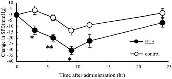 Effects of a single oral administration of ELE in SHR. Change in SPB is expressed as the difference in systolic blood pressure (SPB) before and after administration. ●: ELE (2000 mg/kg); ○: saline as the control. Each value represents the mean ± standard error (S.E.) (n = 5–6), n per group: ELE = 5 and control = 6. * p < 0.05 and ** p < 0.01 (Student t-test).