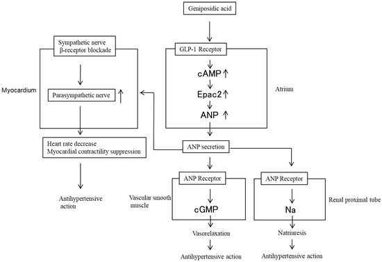 Our study provided the first evidence that oral administration of GEA increased plasma ANP by activating GLP-1R in a rat model of hypertension as an iridoid component isolated from a natural medicinal plant, unlike peptide agonists [7]. This GEA as the agonist appeared to have favorable effects on cardiovascular risk factors, such as blood pressure and lipid levels; however, efficacy has not yet been demonstrated for natural products [10]. Based on results with liraglutide, GEA may act as a GLP-1R agonist and promote the secretion of ANP in SHR [9]; however, ANP secretion by GEA alone and antihypertensive effects have not been observed in humans [11].