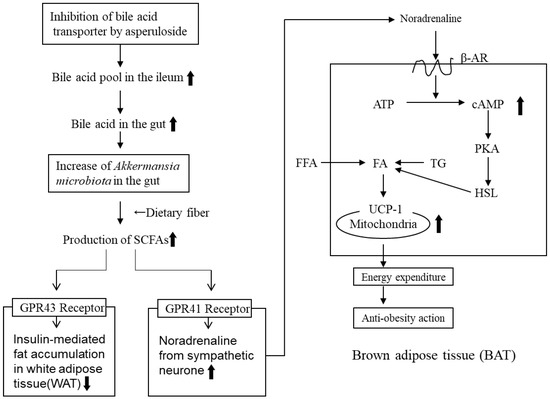The bioavailability of ASP is very low and plasma levels are extremely low in rats (Cmax = 198 ng/mL at 50 mg/kg p.o.). ASP does not readily enter the blood. Once it reaches the ileum, it is hydrolyzed to an unstable aglycone by the intestinal bacteria-derived β-glucosidase [30,31]. It is known that the unstable aglycone from ASP readily binds with proteins, similar to gardenoside [30,31]. Therefore, an increase in the bile acid pool in the gut following ASP administration in rats may be attributable to a reduction of ileal absorption of bile acids by the transporter bound with the aglycone of ASP. Thus, it is likely that the anti-obesity effect of ASP in rodents may be an indirect effect of cholic acid, rather than the direct action of ASP.