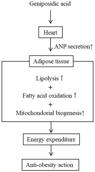 Kimura et al. indicated that ANP-treatment markedly increased UCP1 expression, a specific marker of BAT, in WAT browning and UCP1 expression in BAT with NFD [38]. Accordingly, a cold tolerance test demonstrated that ANP-treated mice were tolerant to cold exposure. Kimura et al. suggests that the administration of agents which increase circulatory ANP levels may have therapeutic benefits based on these results. GEA, which promotes ANP secretion following oral administration, may represent a novel therapeutic agent for metabolic syndromes. This additional mechanism of action for ELE in rats to improve obesity by GEA is presented in Figure 6.