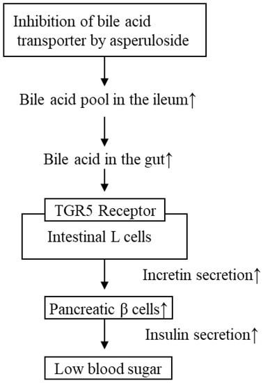 Nakamura et al. observed that incretin concentrations were higher in ASP-treated mice compared with that in HFD groups. Incretin stimulates insulin secretion from pancreatic β-cells in a glucose-dependent manner, whereas increasing and stabilizing incretin levels represents a useful strategy to manage type 2 diabetes [28]. Recently, SCFAs were shown to activate the gut receptors, GPR41 and GPR43, to stimulate L-cells to release incretin. Nakamura et al. produced in vitro data showing the absence of a direct effect of ASP on incretin release in cultured NCI-H716L cells, which is consistent with an indirect effect mediated by increased SCFAs levels. We presumed that one of the blood sugar lowering effects of ASP in rodents may depend on an indirect effect of cholic acid, not on the direct effects of ASP; this being the increase of bile acid pool in the ileum due to the inhibition of bile acid transporter by asperuloside [28,30,31] (Figure 7).