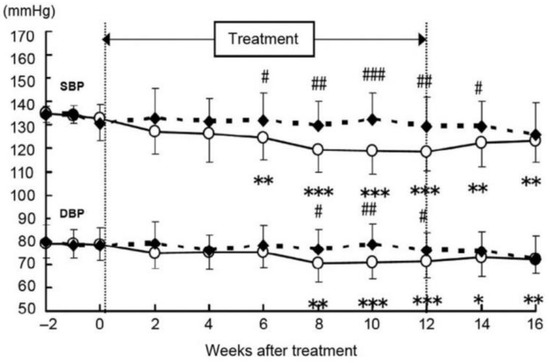The antihypertensive effects of beverages containing ELE (80 mg as GEA) were examined in a randomized, double-blind, placebo-controlled, parallel group study, which was reported by Tsukamoto et al. [40]. The subjects included high normotensive adult male and female subjects. Test or placebo meals were provided once a day for 12 weeks. Significant differences in SBP were observed at 6, 8, 10, and 12 weeks. While diastolic blood pressure (DBP) values were significantly different at 8, 10, and 12 weeks, no changes in BP were observed in the placebo group (Figure 8).