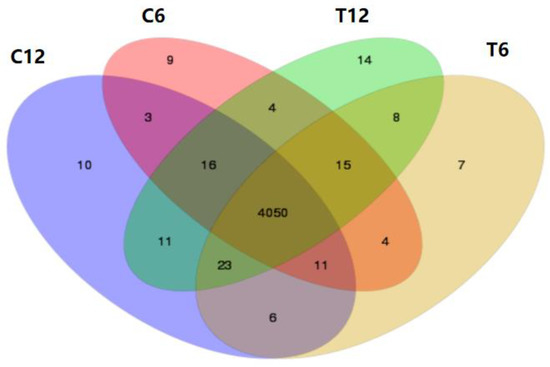 Venn analysis was performed on the transcriptome results from the four sample groups (C6, C12; and T6, T12). These results are shown in Figure 1. Overall, there were 4050 overlapping genes between the control groups (C6, C12) and the experimental groups (T6, T12). Nine genes were exclusive to C6, whereas 10 genes were only expressed in C12. In T6 samples only, seven genes were exclusive; 14 genes were expressed in the T12 group.