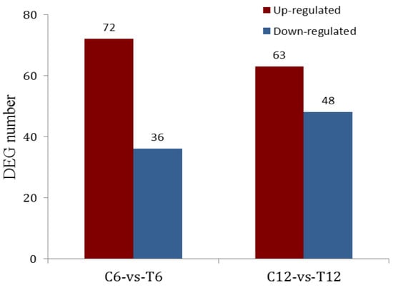 Figure 2 shows the analysis of DEGs with 108 DEGs detected (p < 0.01) after 6-h incubation with TNT, 72 of which were up-regulated and 36 genes down-regulated. On the other hand, 111 DEGs were detected (p < 0.01) after 12 h incubation with TNT-63 and 48 genes were up- and down-regulated, respectively.