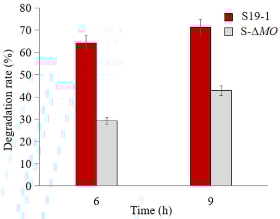 HPLC analysis of the cultures after 6 h and 9 h of TNT (1.4 µg·mL−1) treatment showed that TNT degradation was significantly less in the BuMO knockout strain (S-ΔMO) mutant cultures than in wild-type S19-1 cultures (Figure 4). Exposure to TNT for 6 and 9 h increased the TNT degradation rate of wild-type S19-1 from 64.3% to 71.2% (p < 0.05); in contrast, S-ΔMO mutant degraded TNT by only 29.3% and 42.9% (p < 0.05, Figure 4). This indicates that deficiency of BuMO in the S-ΔMO mutant significantly hinders its TNT degradation ability; this effect may diminish over time due to potential adaptation by the mutant or the induction of alternative pathways to revamp degradation.