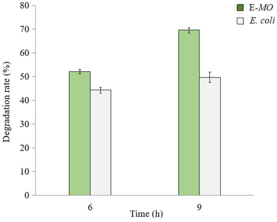 The degradation rate of TNT by E. coli was lower than the BuMO Escherichia coli expression strain (E-MO) mutant, which increased from 45.1% to 50.2% with time without significantly improving the degradation efficiency (Figure 5). In contrast, BuMO expression in the E-MO mutant increased TNT degradation from 52.1% to 69.5% by about 1.33-fold, as exposure time increases (p < 0.05).